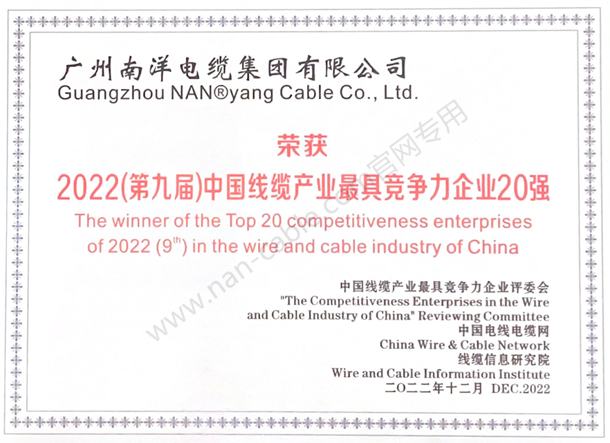 廣東線纜行業(yè)最具競爭力企業(yè)第一名、中國線纜行業(yè)最具競爭力企業(yè)20強(qiáng)、華南地區(qū)電線電纜研發(fā)制造龍頭企業(yè)
